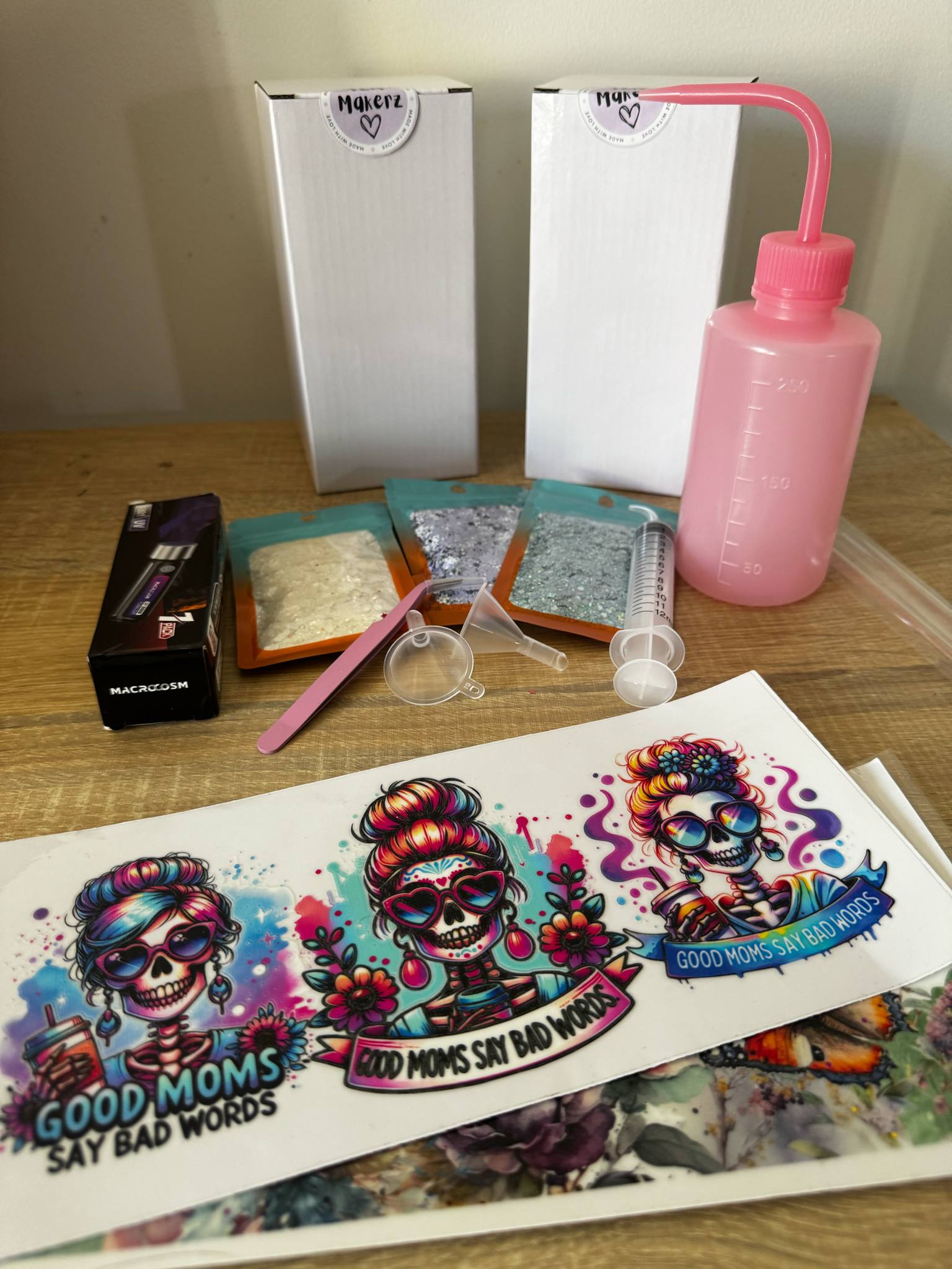 Included: 2 acrylic snow globes, 1x solution bottle,1x uv torch, 1xtweezers, 2x funnels, 3x random wraps, 3x random glitters.